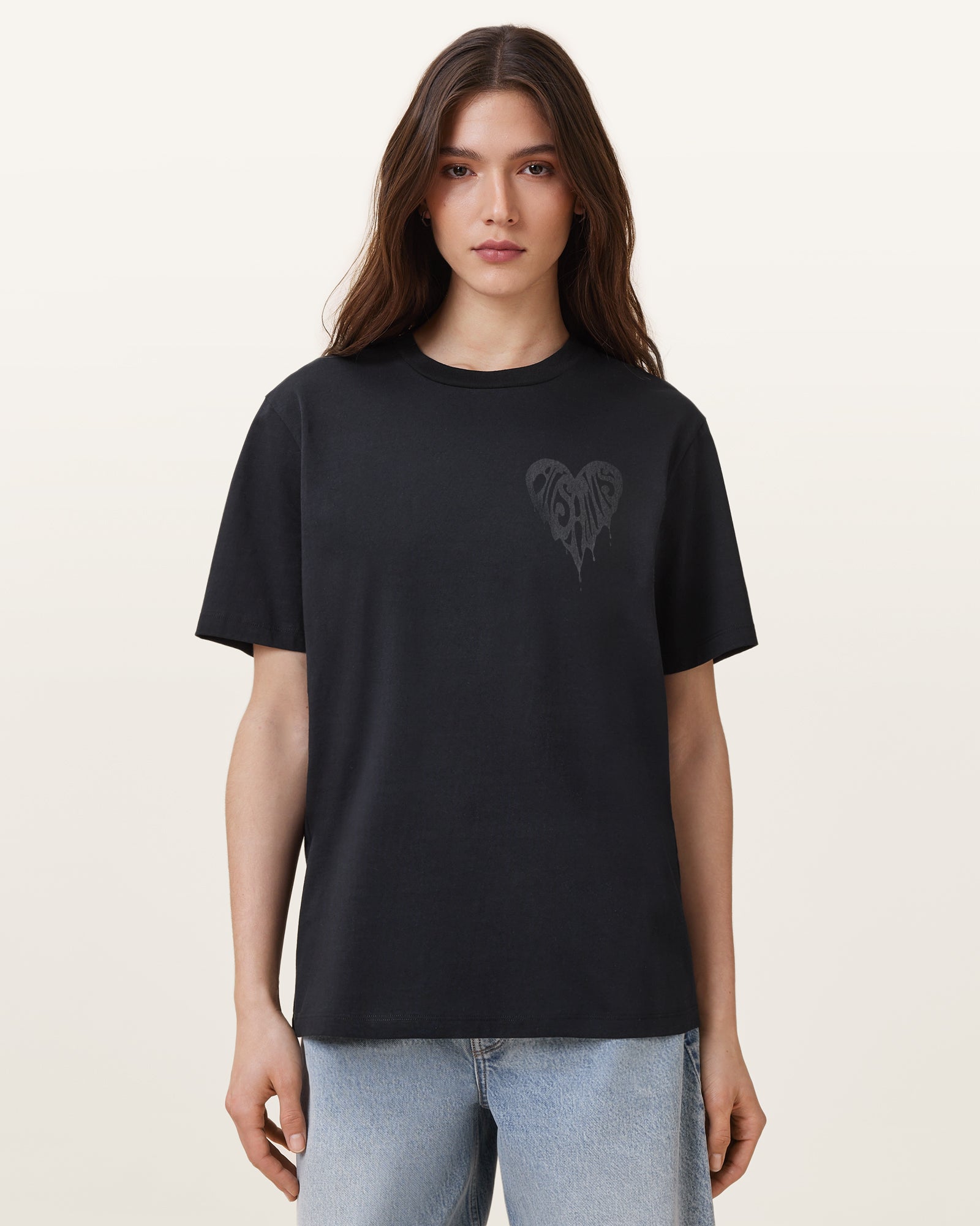 Who doesn’t love a boyfriend tee? Our logo within a heartshape design shows we clearly do. Made with easy dressing in mind. this is a go-to for festival season. No matter who your crew is. being proud of who you are is AllSaints at our core – which is why our name is proudly embellished on this tee’s back. Be proudly you. proudly unique – proudly AllSaints.